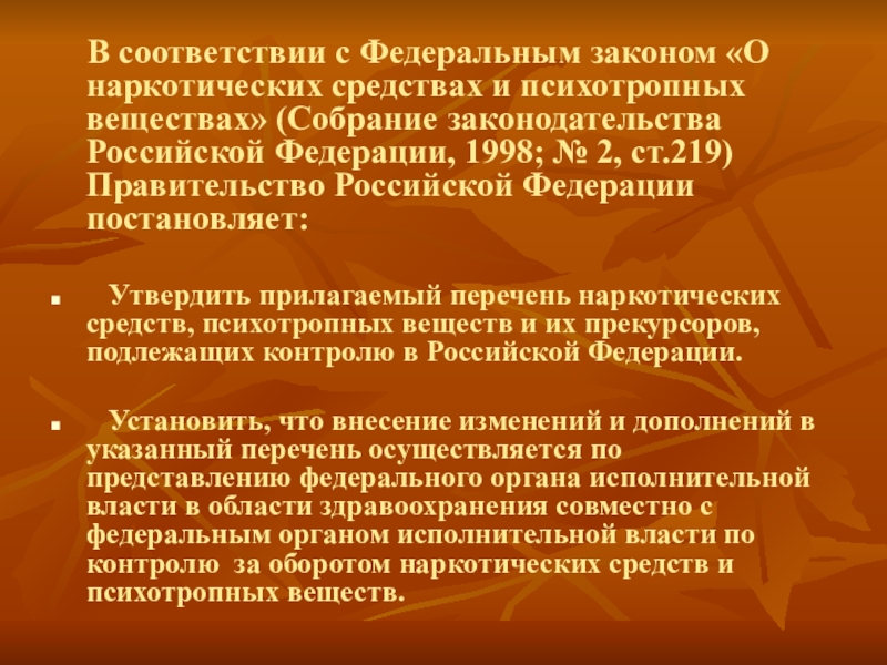 Установить, что внесение изменений и дополнений в указанный перечень осуществляется по представлению федерального органа исполнительной власти в области здравоохранения совместно с федеральным органом исполнительной власти по контролю за оборотом наркотических средств и психотропных веществ.