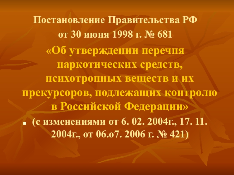 перечня наркотических средств, психотропных веществ и их прекурсоров, подлежащих контролю в Российской Федерации»