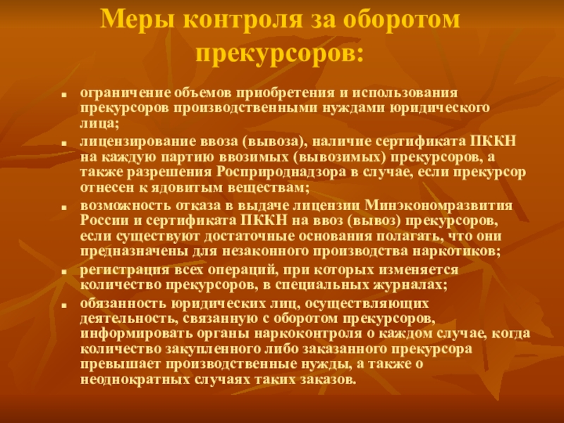 Слайд 10Меры контроля за оборотом прекурсоров:
