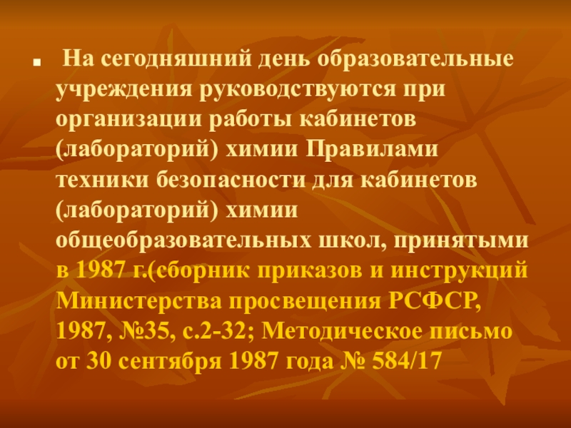(лабораторий) химии Правилами техники безопасности для кабинетов(лабораторий) химии общеобразовательных школ, принятыми в 1987 г.(сборник приказов и инструкций Министерства просвещения РСФСР, 1987, №35, с.2-32; Методическое письмо от 30 сентября 1987 года № 584/17