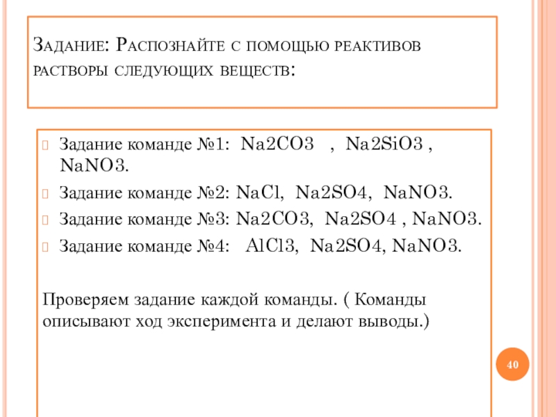 Слайд 40Задание: Распознайте с помощью реактивов растворы следующих веществ: