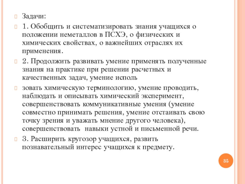Слайд 34Цель: обобщить и систематизировать знания учащихся о свойствах и применении неметаллов