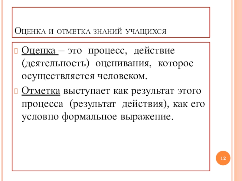 Слайд 12Оценка и отметка знаний учащихся