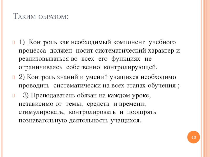3) Преподаватель обязан на каждом уроке, независимо от темы, средств и времени, стимулировать, контролировать и поощрять познавательную деятельность учащихся.