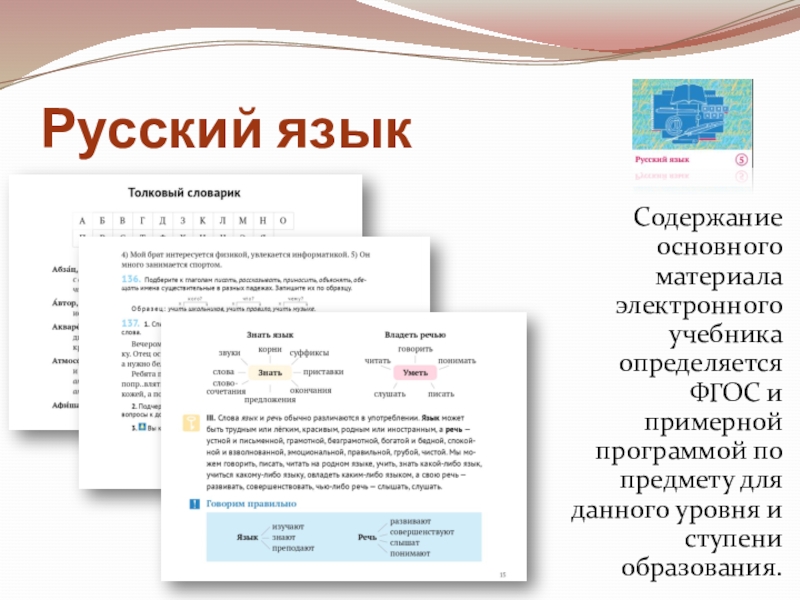 Электронный учебник – учебное электронное издание, содержащее систематическое изложение учебной дисциплины, ее раздела, части, соответствующее учебной программе, поддерживающее основные звенья дидактического цикла процесса обучения, являющееся важным компонентом индивидуализированной активно-деятельностной образовательной среды и официально утвержденное в качестве данного вида издания.
