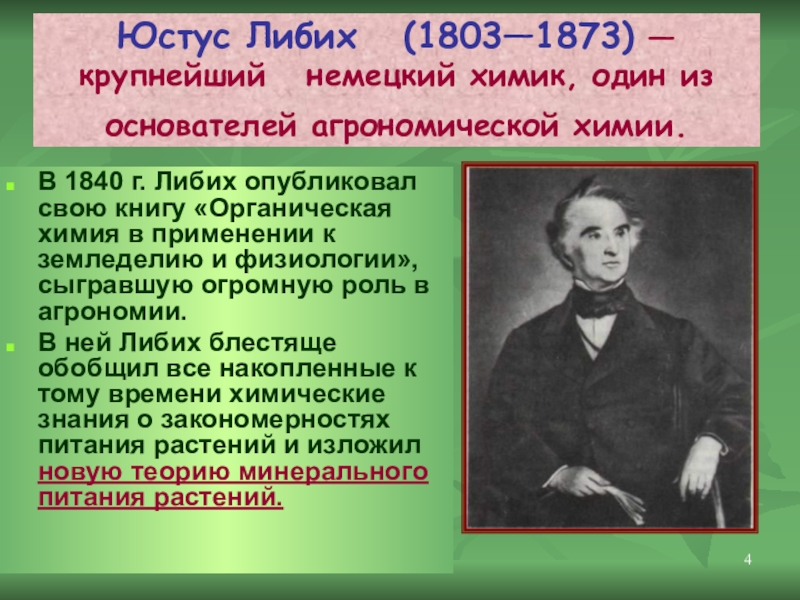 В 1840 г. Либих опубликовал свою книгу «Органическая химия в применении к земледелию и физиологии», сыгравшую огромную роль в агрономии.