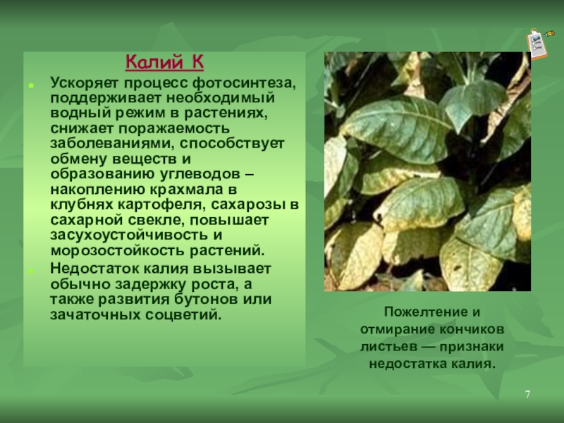 Пожелтение и отмирание кончиков листьев — признаки недостатка калия.