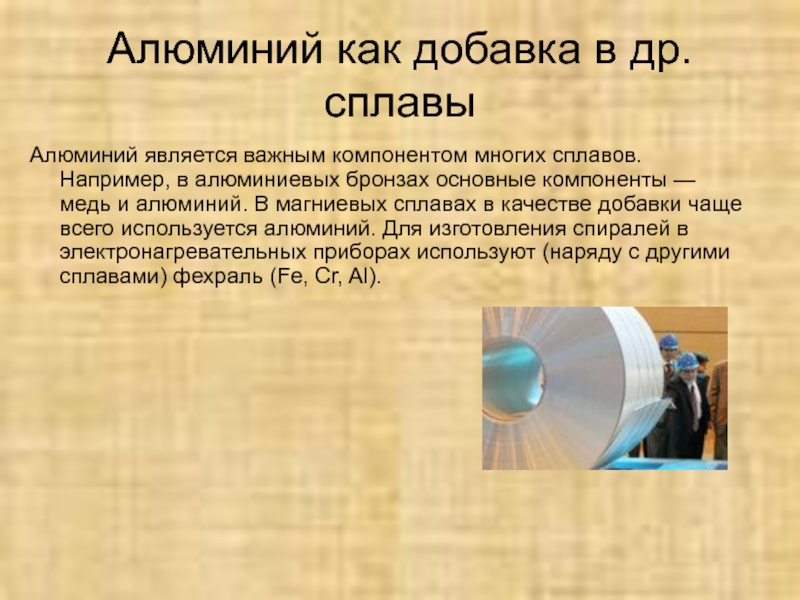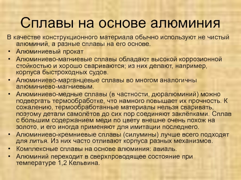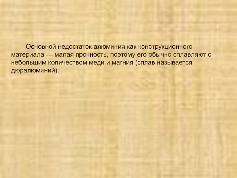 Слайд 4 Основной недостаток алюминия как конструкционного материала — малая прочность, поэтому его