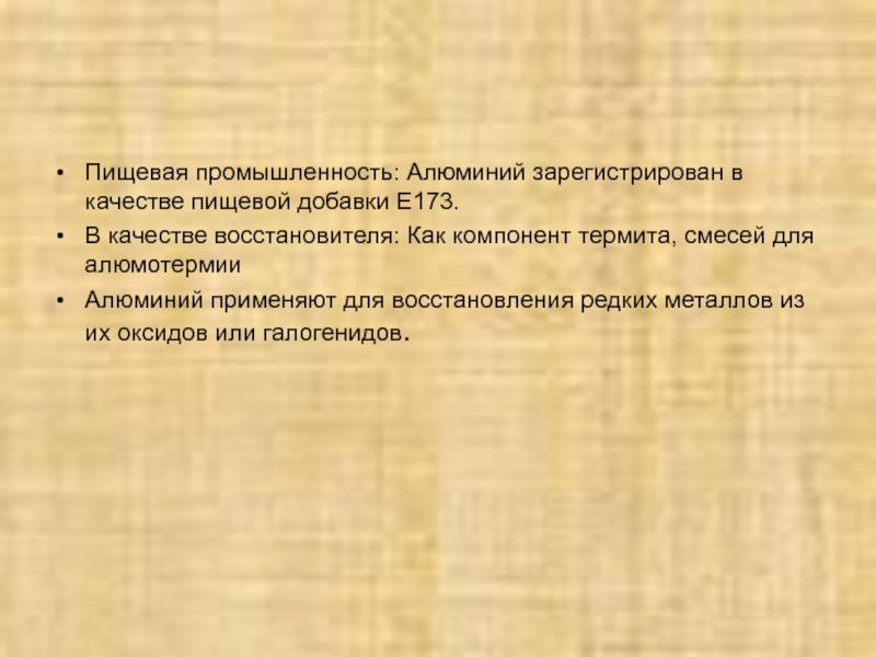 Слайд 11Пищевая промышленность: Алюминий зарегистрирован в качестве пищевой добавки Е173.