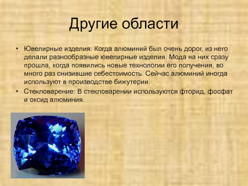 разнообразные ювелирные изделия. Мода на них сразу прошла, когда появились новые технологии его получения, во много раз снизившие себестоимость. Сейчас алюминий иногда используют в производстве бижутерии.
