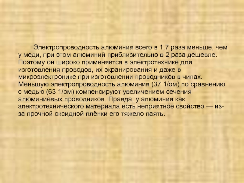 Слайд 5 Электропроводность алюминия всего в 1,7 раза меньше, чем у меди, при