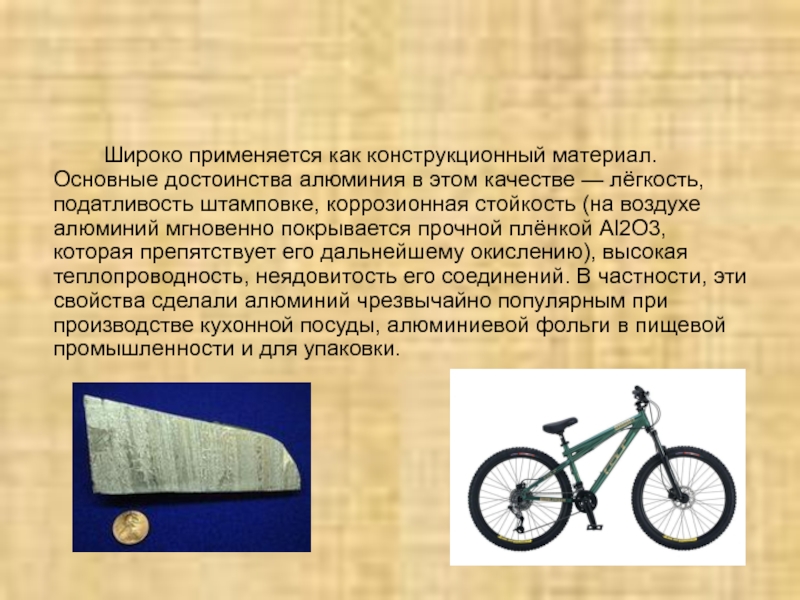 Слайд 3 Широко применяется как конструкционный материал. Основные достоинства алюминия в этом качестве