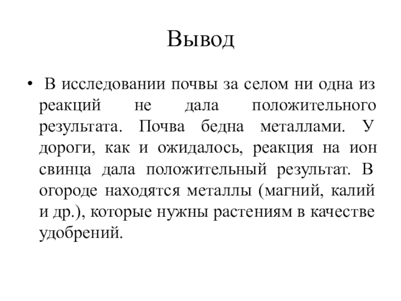 Вывод В исследовании почвы за селом ни одна из реакций не дала положительного результата. Почва бедна металлами.