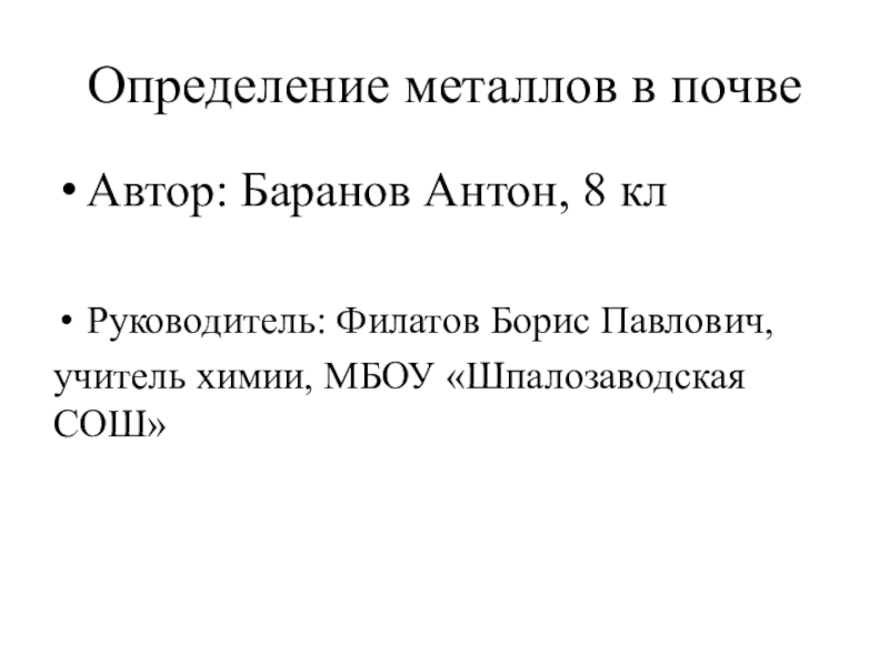 Определение металлов в почвеАвтор: Баранов Антон, 8 клРуководитель: Филатов Борис Павлович, учитель химии, МБОУ «Шпалозаводская СОШ»