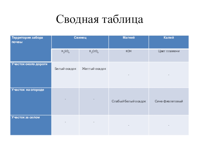 дала положительного результата. Почва бедна металлами. У дороги, как и ожидалось, реакция на ион свинца дала положительный результат. В огороде находятся металлы (магний, калий и др.), которые нужны растениям в качестве удобрений.