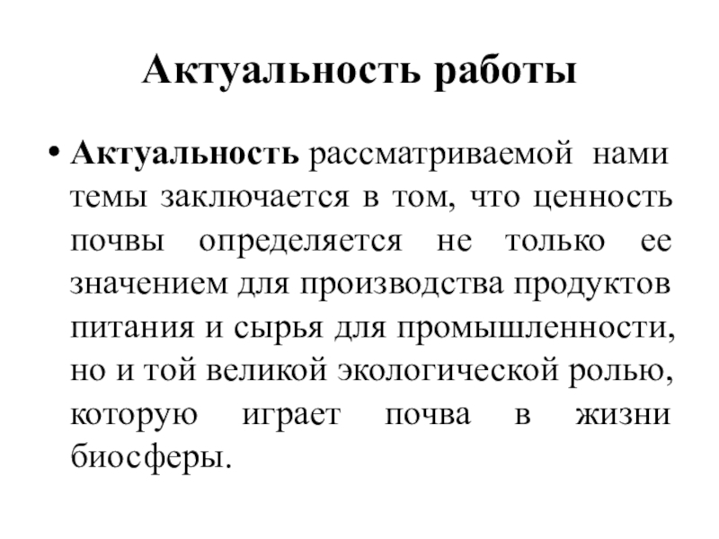 Актуальность работыАктуальность рассматриваемой нами темы заключается в том, что ценность почвы определяется не только ее значением для производства