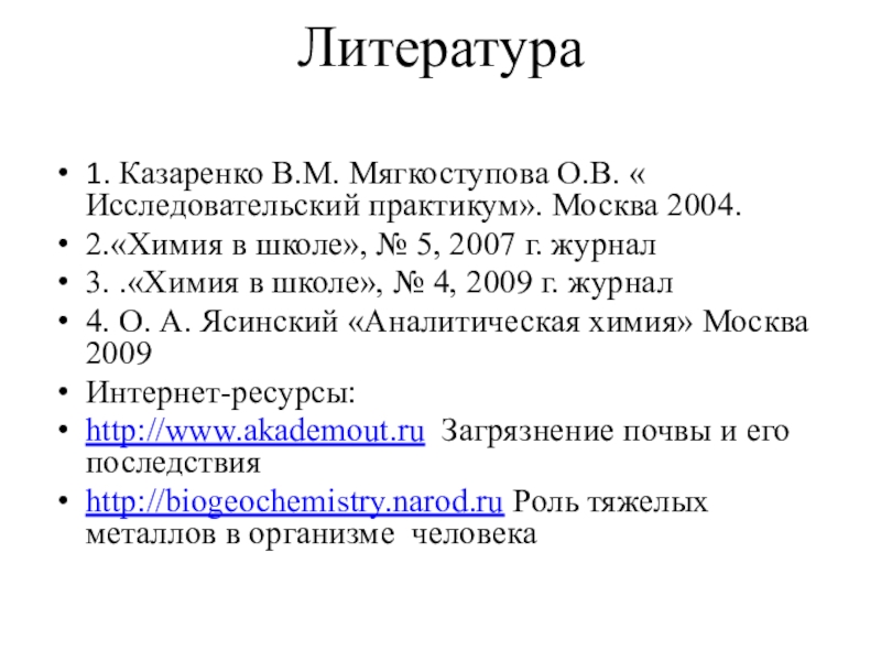 Литература 1. Казаренко В.М. Мягкоступова О.В. « Исследовательский практикум». Москва 2004.2.«Химия в школе», № 5, 2007 г.