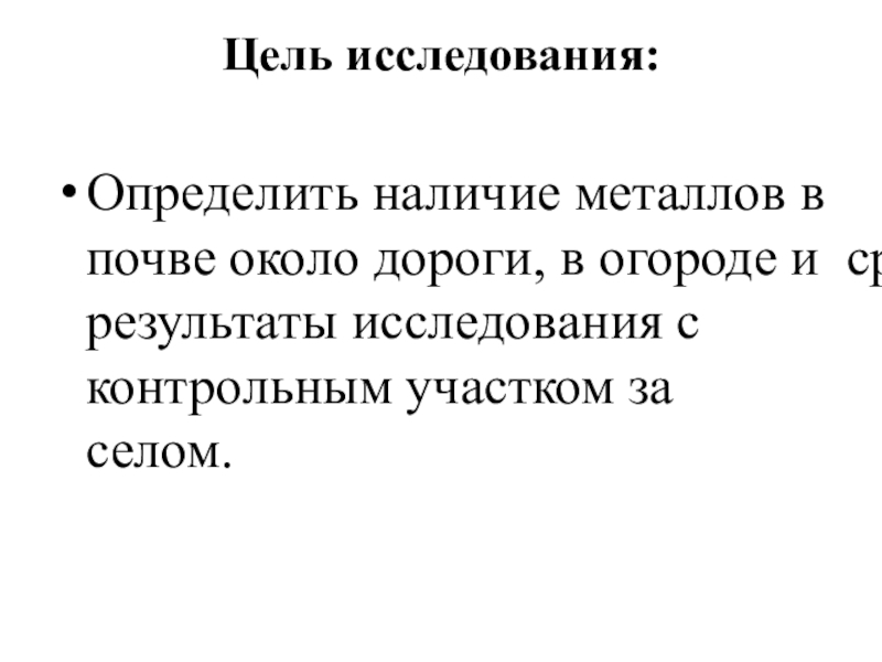 Цель исследования: Определить наличие металлов в почве около дороги, в огороде и  сравнить результаты исследования с контрольным участком за селом.