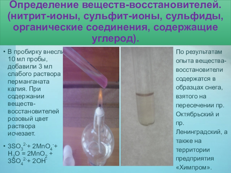 По результатам опыта вещества-восстановители содержатся в образцах снега, взятого на пересечении пр. Октябрьский и пр. Ленинградский, а также на территории предприятия «Химпром».