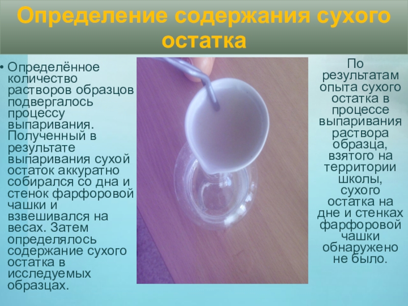 По результатам опыта сухого остатка в процессе выпаривания раствора образца, взятого на территории школы, сухого остатка на дне и стенках фарфоровой чашки обнаружено не было.