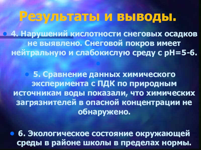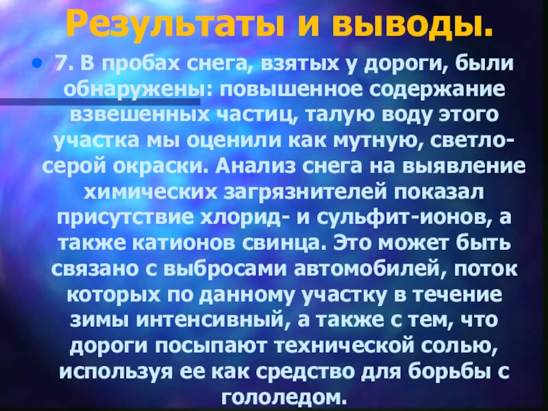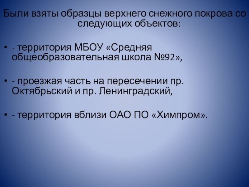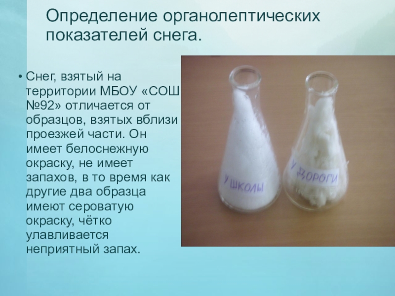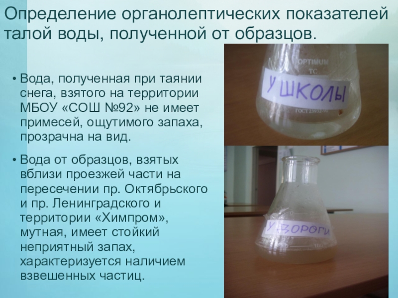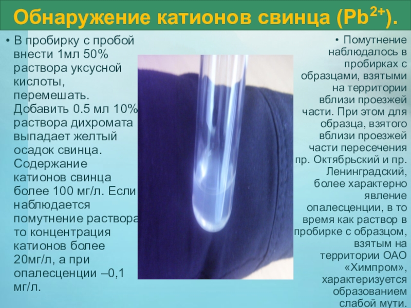 Помутнение наблюдалось в пробирках с образцами, взятыми на территории вблизи проезжей части. При этом для образца, взятого вблизи проезжей части пересечения пр. Октябрьский и пр. Ленинградский, более характерно явление опалесценции, в то время как раствор в пробирке с образцом, взятым на территории ОАО «Химпром», характеризуется образованием слабой мути.