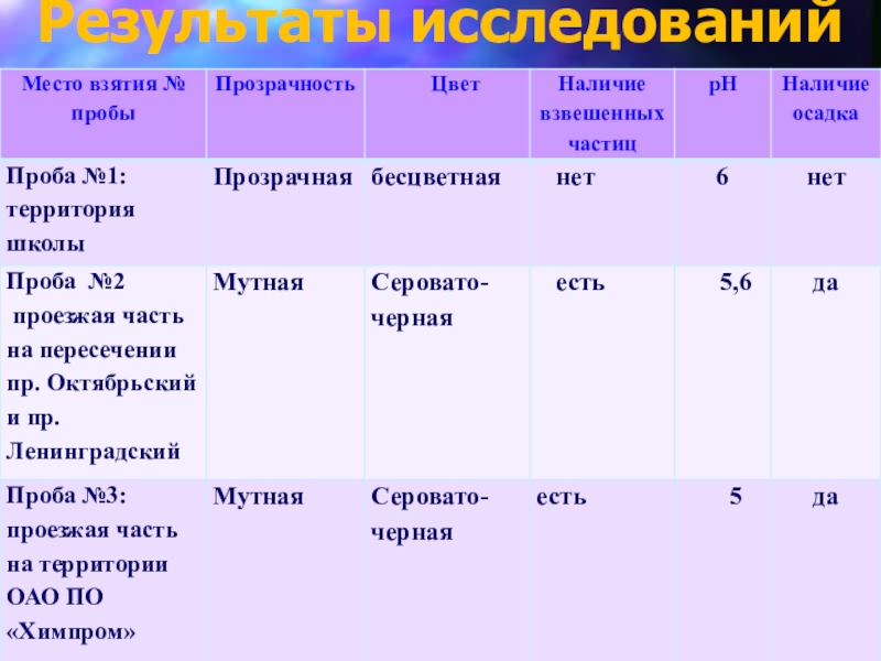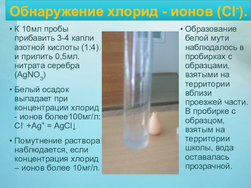 Образование белой мути наблюдалось в пробирках с образцами, взятыми на территории вблизи проезжей части. В пробирке с образцом, взятым на территории школы, вода оставалась прозрачной.
