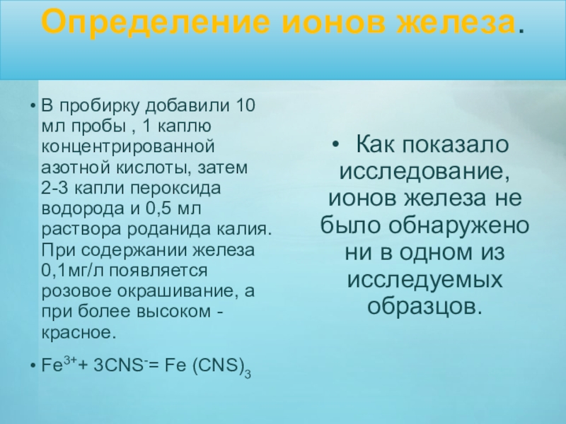 Как показало исследование, ионов железа не было обнаружено ни в одном из исследуемых образцов.