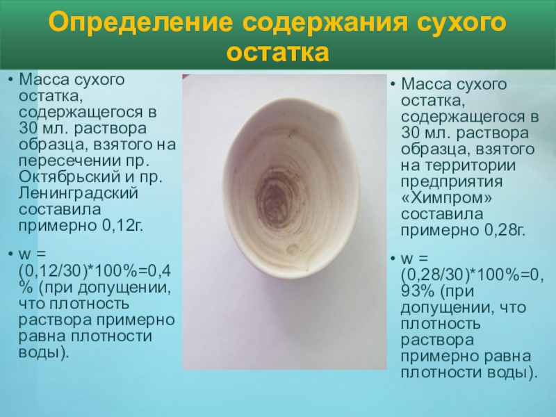 Масса сухого остатка, содержащегося в 30 мл. раствора образца, взятого на территории предприятия «Химпром» составила примерно 0,28г.