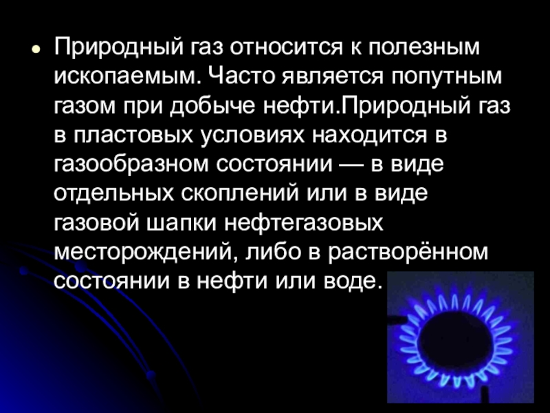 Природный газ относится к полезным ископаемым. Часто является попутным газом при добыче нефти.Природный газ в пластовых условиях