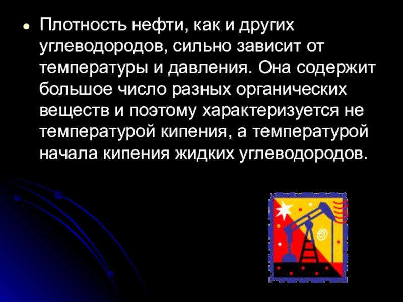 Плотность нефти, как и других углеводородов, сильно зависит от температуры и давления. Она содержит большое число разных