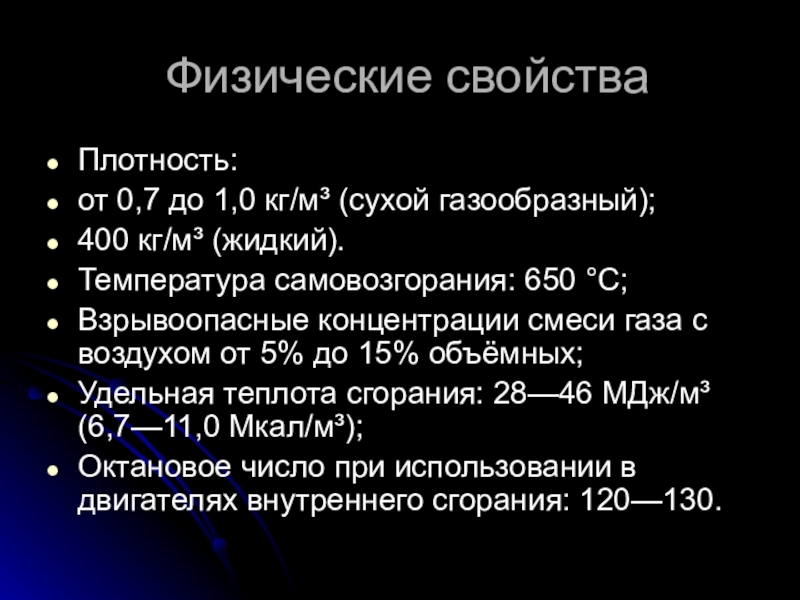 Физические свойстваПлотность: от 0,7 до 1,0 кг/м³ (сухой газообразный);400 кг/м³ (жидкий).Температура самовозгорания: 650 °C;Взрывоопасные концентрации смеси газа