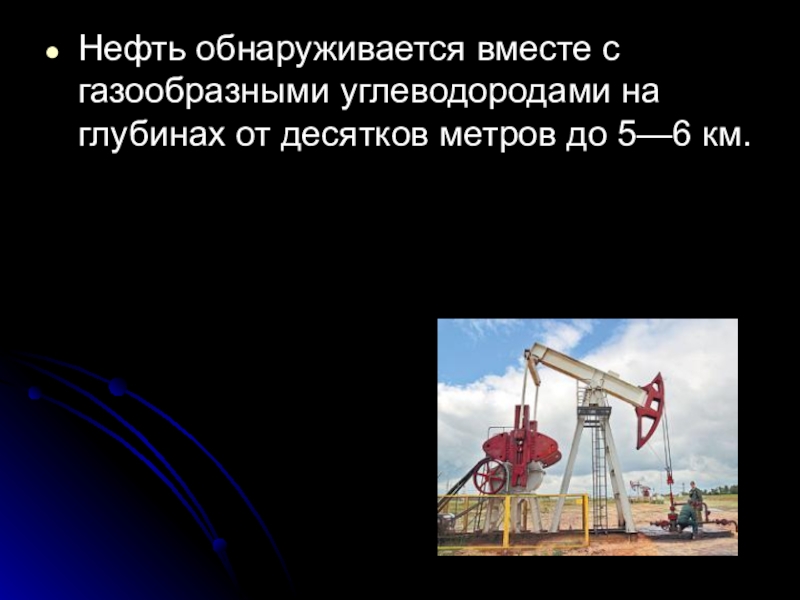 Нефть обнаруживается вместе с газообразными углеводородами на глубинах от десятков метров до 5—6 км.