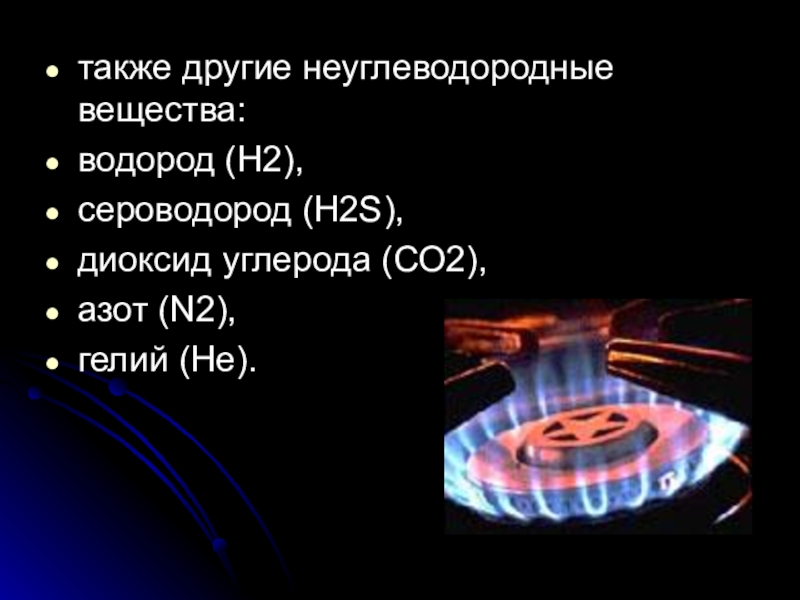 также другие неуглеводородные вещества:водород (H2),сероводород (H2S),диоксид углерода (СО2),азот (N2),гелий (Не).