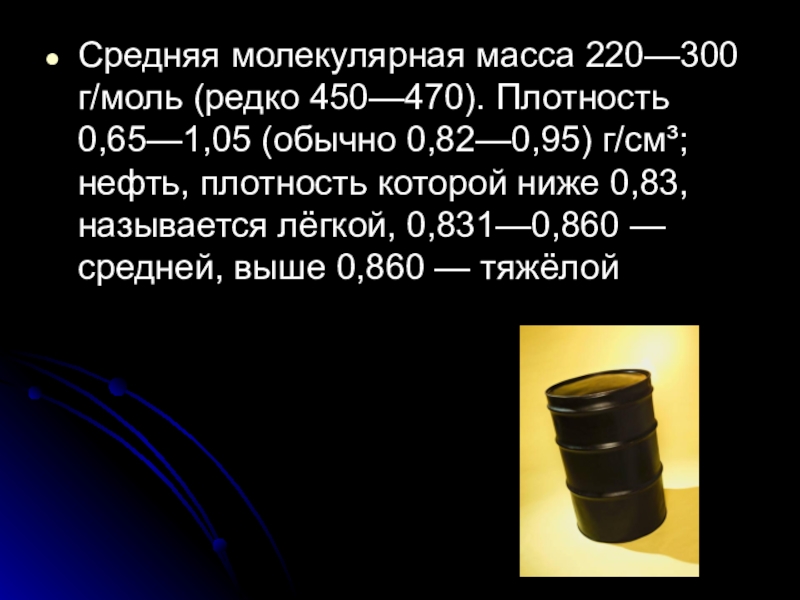 Средняя молекулярная масса 220—300 г/моль (редко 450—470). Плотность 0,65—1,05 (обычно 0,82—0,95) г/см³; нефть, плотность которой ниже 0,83,