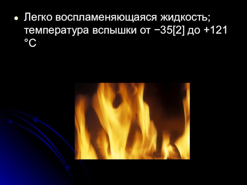 Легко воспламеняющаяся жидкость; температура вспышки от −35[2] до +121 °C
