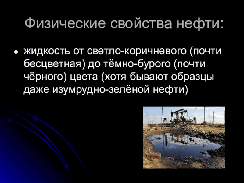Физические свойства нефти:жидкость от светло-коричневого (почти бесцветная) до тёмно-бурого (почти чёрного) цвета (хотя бывают образцы даже изумрудно-зелёной