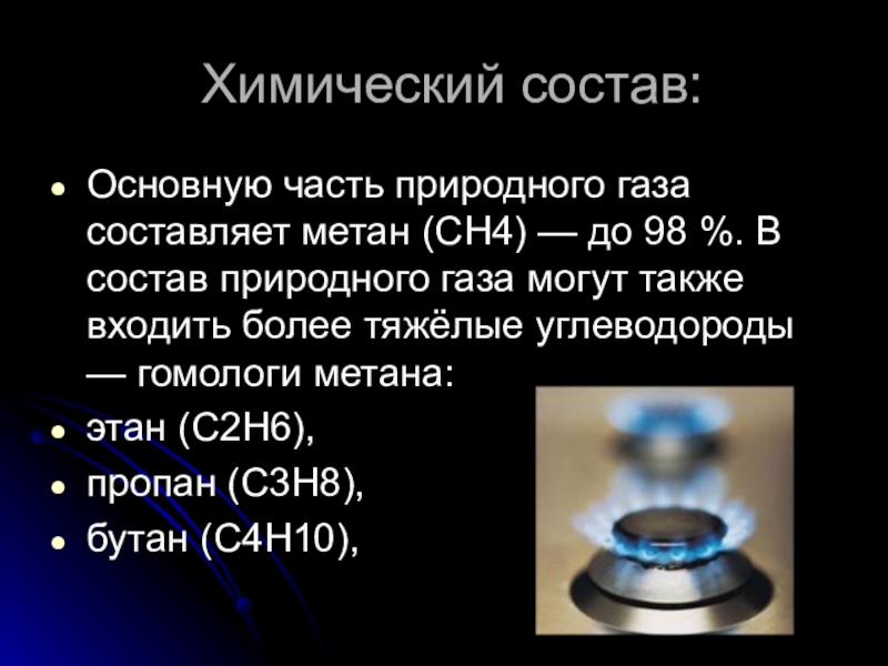 Химический состав:Основную часть природного газа составляет метан (CH4) — до 98 %. В состав природного газа могут