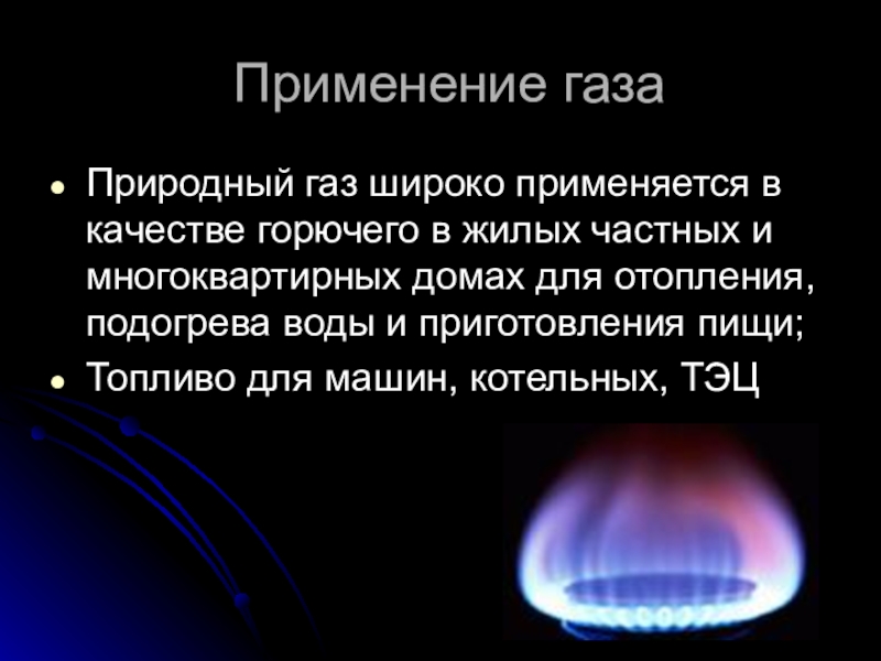 Применение газаПриродный газ широко применяется в качестве горючего в жилых частных и многоквартирных домах для отопления, подогрева