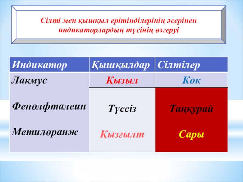 Слайд 7Сілті мен қышқыл ерітінділерінің әсерінен индикаторлардың түсінің өзгеруі