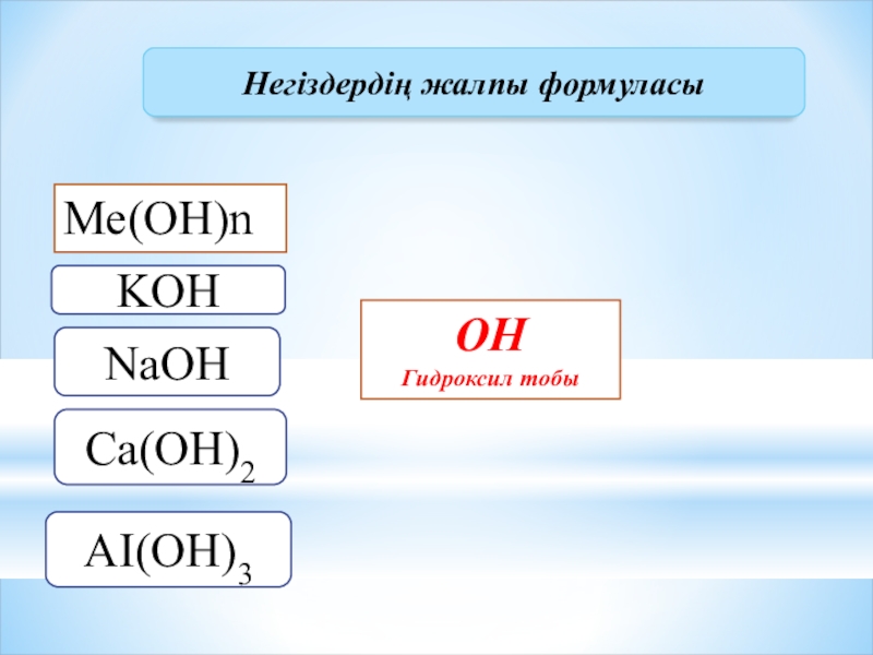 Негіздердің жалпы формуласыMe(ОН)nОН Гидроксил тобыKOНNaOНСа(ОН)2АІ(OН)3