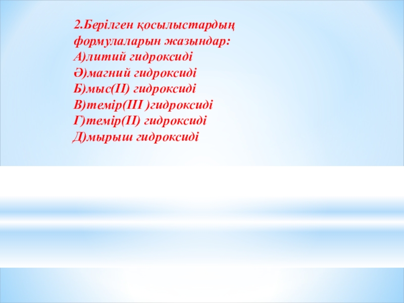 2.Берілген қосылыстардың формулаларын жазындар:А)литий гидроксидіӘ)магний гидроксидіБ)мыс(ІІ) гидроксидіВ)темір(ІІІ )гидроксидіГ)темір(ІІ) гидроксидіД)мырыш гидроксиді