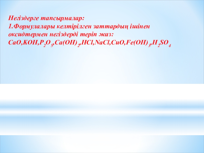 Негіздерге тапсырмалар:1.Формулалары келтірілген заттардың ішінен оксидтермен негіздерді теріп жаз:CaO,KOH,P2O5,Ca(OH)2,HCl,NaCl,CuO,Fe(OH)3,H2SO4