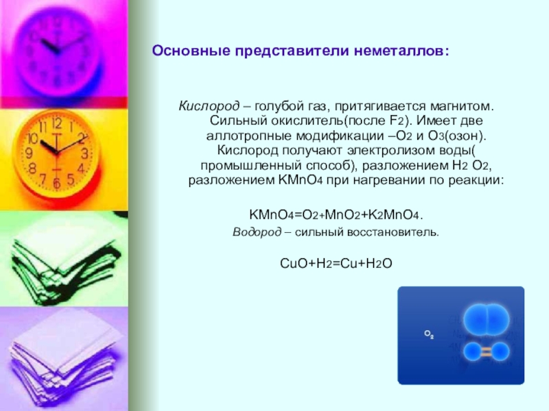 Основные представители неметаллов:Кислород – голубой газ, притягивается магнитом. Сильный окислитель(после F2). Имеет две аллотропные модификации –O2 и