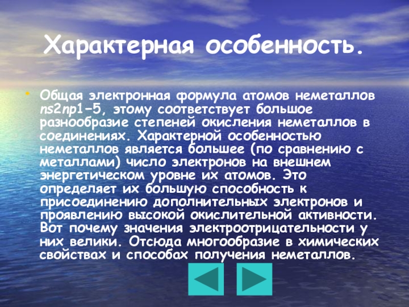 Характерная особенность.Общая электронная формула атомов неметаллов ns2np1−5, этому соответствует большое разнообразие степеней окисления неметаллов в соединениях. Характерной