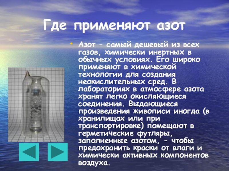 в обычных условиях. Его широко применяют в химической технологии для создания неокислительных сред. В лабораториях в атмосфере азота хранят легко окисляющиеся соединения. Выдающиеся произведения живописи иногда (в хранилищах или при транспортировке) помещают в герметические футляры, заполненные азотом, - чтобы предохранить краски от влаги и химически активных компонентов воздуха.