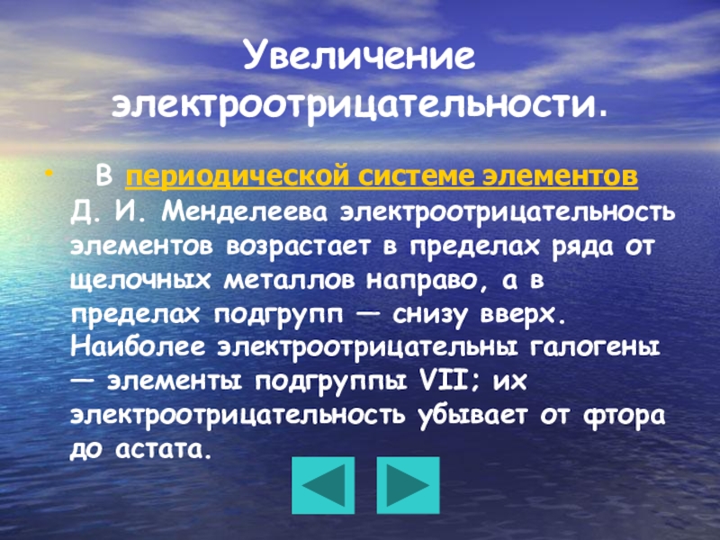 Увеличение электроотрицательности.  В периодической системе элементов Д. И. Менделеева электроотрицательность элементов возрастает в пределах ряда от щелочных