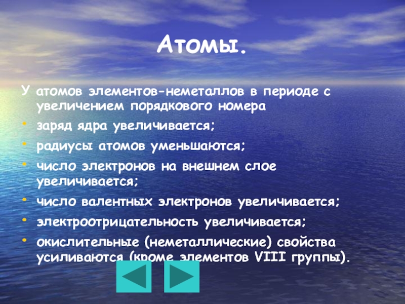 Атомы.У атомов элементов-неметаллов в периоде с увеличением порядкового номеразаряд ядра увеличивается; радиусы атомов уменьшаются; число электронов на