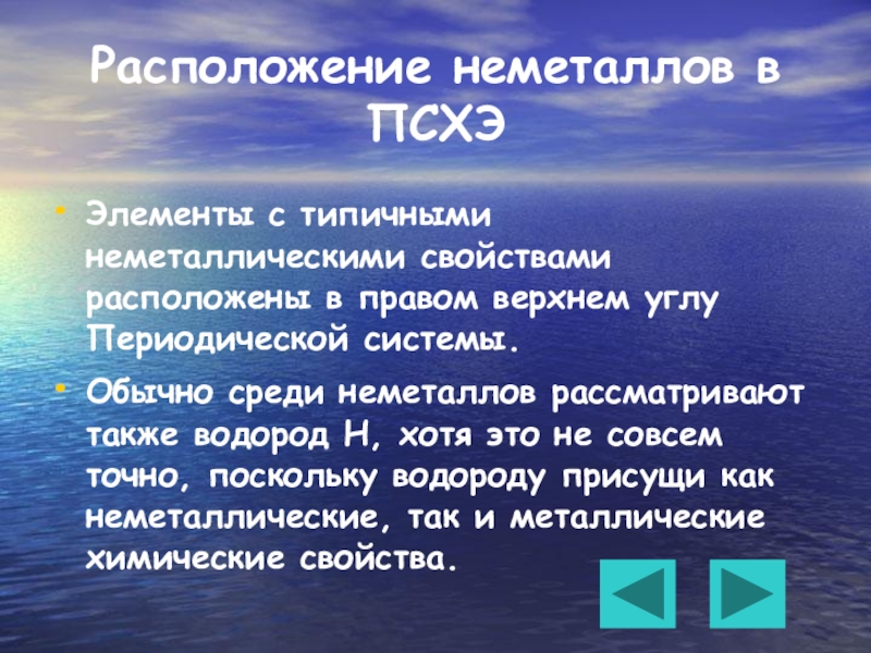 Расположение неметаллов в ПСХЭЭлементы с типичными неметаллическими свойствами расположены в правом верхнем углу Периодической системы.Обычно среди неметаллов рассматривают также водород Н, хотя это не совсем точно, поскольку водороду присущи как неметаллические, так и металлические химические свойства.