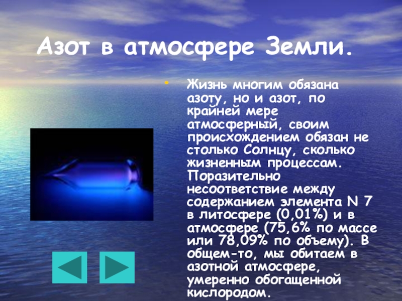 Азот в атмосфере Земли.Жизнь многим обязана азоту, но и азот, по крайней мере атмосферный, своим происхождением обязан