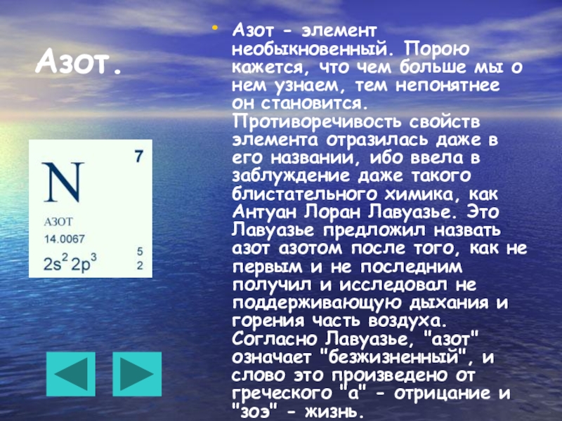 Азот.Азот - элемент необыкновенный. Порою кажется, что чем больше мы о нем узнаем, тем непонятнее он становится.